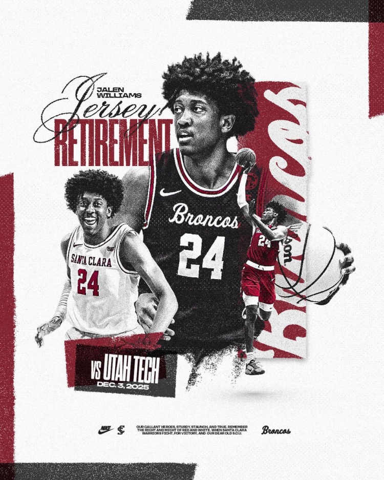 12月2日訊 今日美國(guó)加州圣塔克拉拉大學(xué)男籃官方宣布,球隊(duì)將退役杰倫·威廉姆斯大學(xué)時(shí)期球衣。
