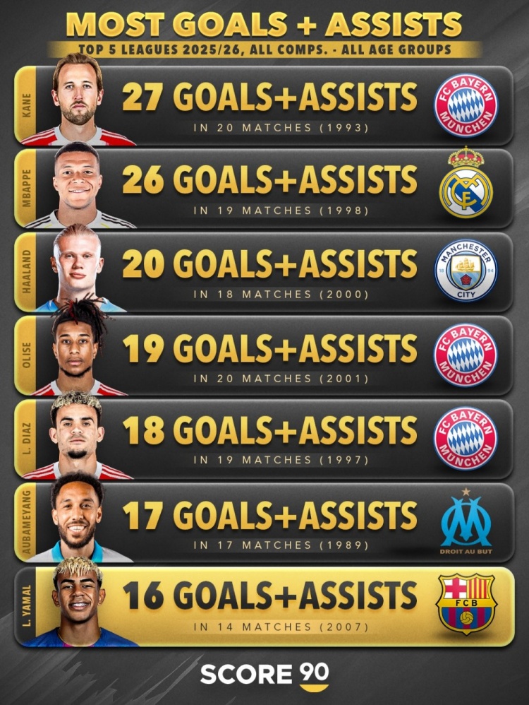 本賽季五大聯(lián)賽球員參與進(jìn)球榜(所有賽事):