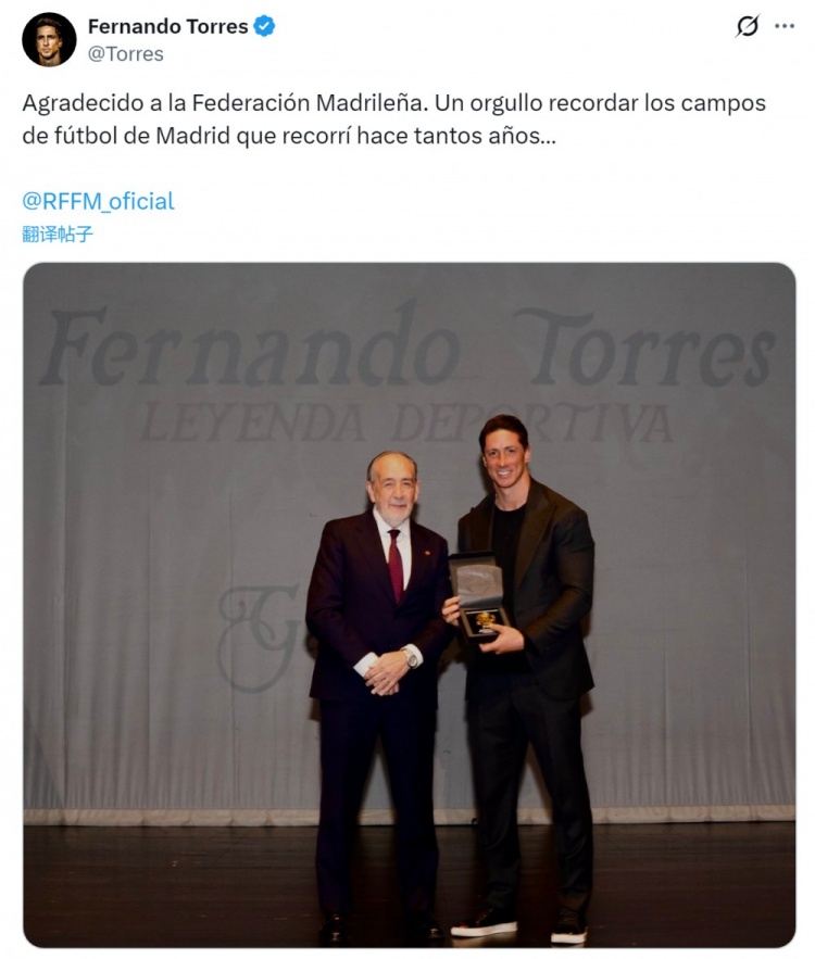 托雷斯社媒曬出領(lǐng)獎(jiǎng)?wù)掌?,并寫道:“由衷感謝馬德里足球協(xié)會(huì)。追憶多年前馳騁馬德里綠茵場(chǎng)的歷程,至今仍倍感自豪?!?/p>