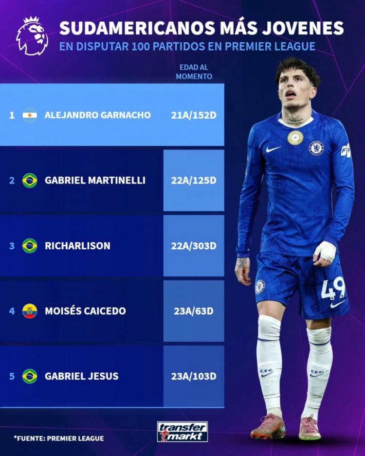 - 英超百場最年輕南美球員榜:加納喬居首,馬丁內(nèi)利、里沙利松前三