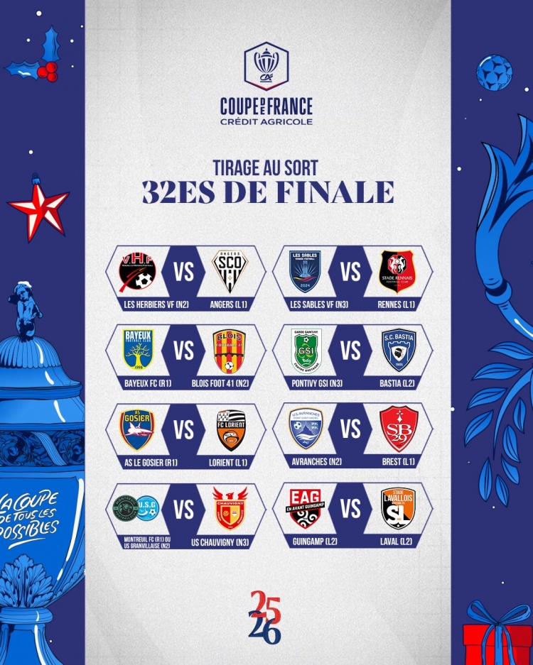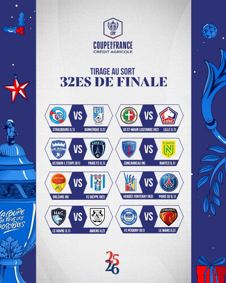 - 法國杯32強抽簽:斯特拉斯堡VS敦刻爾克 旺代豐特奈VS巴黎