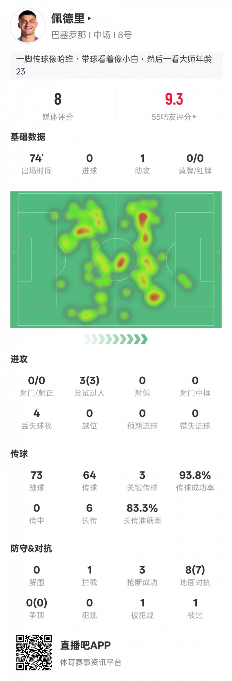 佩德里本場(chǎng)比賽數(shù)據(jù)如下: